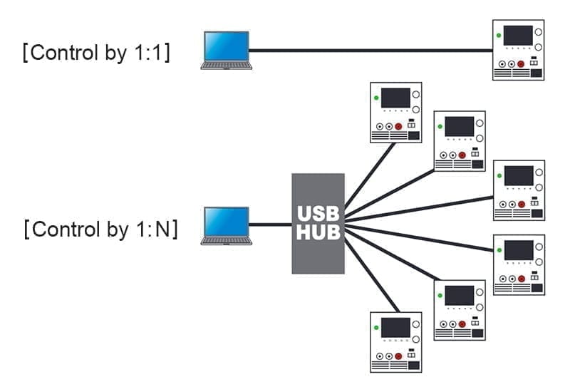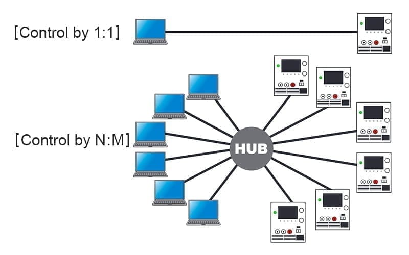 PMX-A 시리즈는 통신 인터페이스로서 LAN, USB, RS232C를 표준으로 장착하고 있습니다. 1 대 N은 물론 N 대 M이며 대규모 네트워크형 원격 제어・감시를 효율적으로 수행할 수 있습니다. LAN 통신에서는 PC, 스마트폰, 태블릿 등의 WEB 브라우저에서 PMX-A 시리즈에 내장된 WEB 서버에 접속하여 전원 공급 장치를 제어・감시할 수 있습니다.