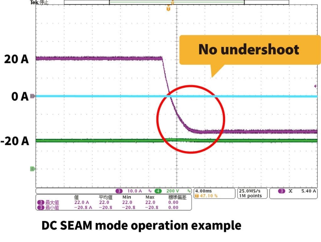 전압값을 변경하지 않고 전류를 양방향으로 흘릴 수 있는 SEAM모드를 탑재. 축전지의 충전·방전을 실시할 때에 적합합니다. 충방전 전환 후의 동작모드 전환시에 발생하기 쉬운 전류의 오버슈트나 언더슈트를 억제할 수 있습니다.