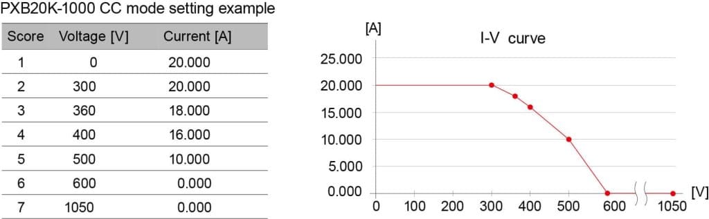 I-V특성상의 임의의 점을 복수 등록함으로써, 임의의 I-V특성을 CC,CV의 동작모드별로 설정할 수 있습니다. 임의의 점은 3점~100점까지 등록할 수 있어, 이차전지 등의 I-V특성을 시뮬레이션하는 것이 가능합니다.