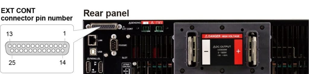 후면패널의 EXT CONT 커넥터를 사용하여, 외부기기로 PXB시리즈를 제어할 수 있습니다. 범용 디지털 입력단자와 범용 디지털 출력단자에는, 임의의 기능을 할당할 수 있어, 기타 계측기기와의 조합에 의한 시스템 구축이 용이합니다.