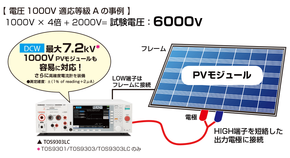IEC61730-2 및 JIS C 8992-2 등의 내전압 시험에서는 시험 전압을 최대 시스템 전압 × 4배+2000V까지 상승시킨 후, 전압을 1분간 유지시킵니다.