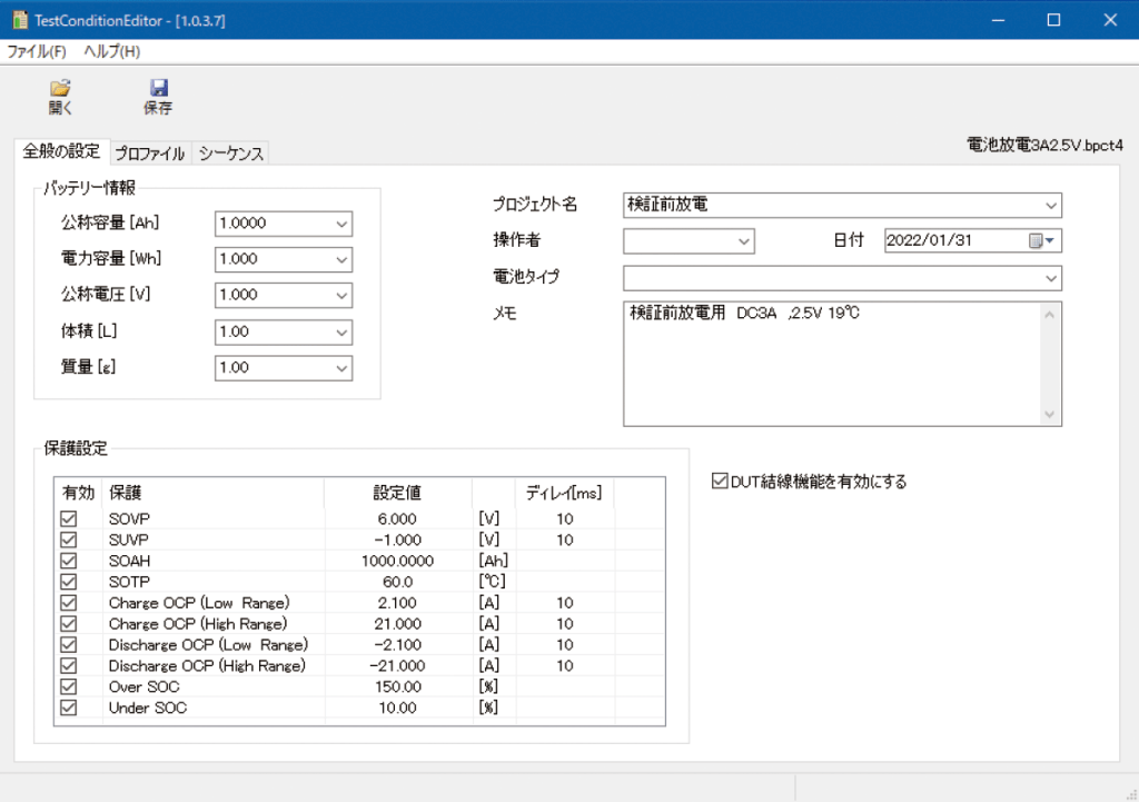충방전에 관련된 모든 시험 조건의 작성 및 편집을 수행하는 프로그램입니다. 프로파일을 작성한 후 시퀀스 및 전체 설정 등을 수행하여 프로젝트를 작성합니다. BPC4000은 이 프로젝트 단위로 시험을 실행합니다.